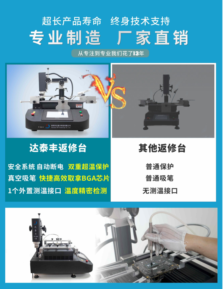 - 上部加熱功率: 1200W(加強版本,可適用于大芯片、大散熱類產(chǎn)品),風(fēng)量可以調(diào)節(jié),最大風(fēng)量25m/s,使用功率由升溫速度與環(huán)境溫度有關(guān),適配200W-1200W使用要求